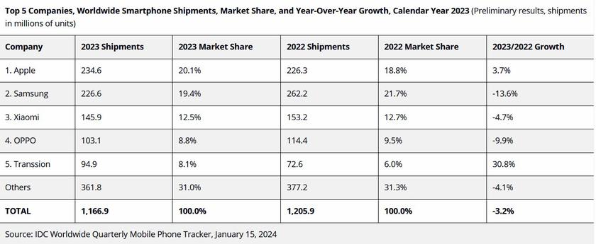 Podle předběžných údajů společnosti IDC se situace na globálním trhu s chytrými telefony v roce 2023 změnila a Samsung již není nesporným lídrem.