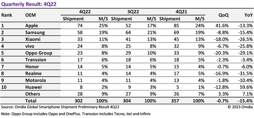 Ve čtvrtém čtvrtletí se ve srovnání se třetím zhoršila výkonnost všech společností v první desítce. S výjimkou Applu Prodal 74 milionů chytrých telefonů oproti 52 milionům, díky čemuž předstihl Samsung a zvýšil svůj podíl na 25 %. Na druhou stranu meziroční dodávky iPhonů klesly o 13,3 % na 85 milionů.