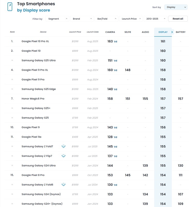 Google Pixel 10 Pro XL, představený v srpnu 2025, získal rekordních 161 bodů a předčil své nejbližší konkurenty – Samsung Galaxy S25 Ultra a Google Pixel 10, které získaly po 160 bodech.