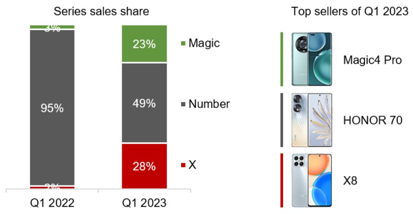 Na začátku roku 2022 byly nejoblíbenější modely číselné řady (Honor 70, Honor 60...). Tvořily 95 % prodejů. Nyní je podíl těchto smartphonů pouze 49 %. Explozivní růst vykázala dražší zařízení řady X (Honor X8...) a vlajkové lodě Magic.
