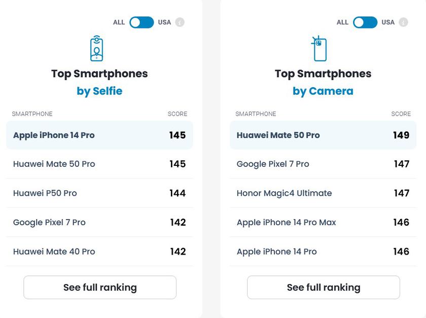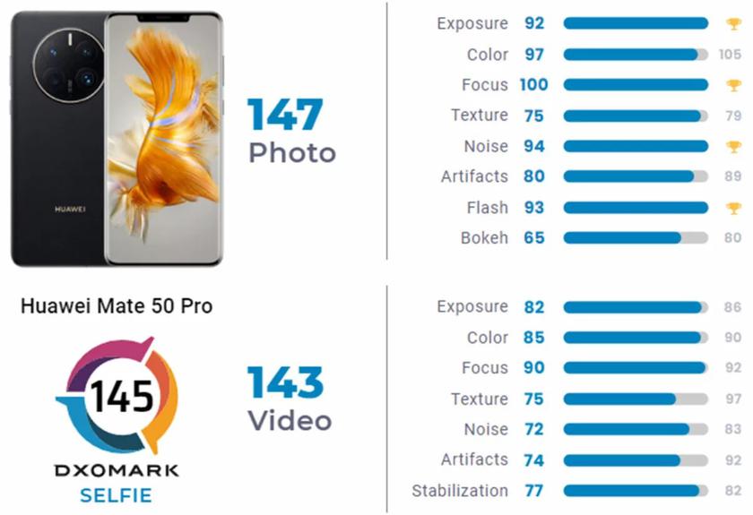 Díky tomu je Huawei Mate 50 Pro lídrem i v hodnocení selfies podle DxOMark. Jeho průměrné skóre je 145 bodů: 147 bodů za fotografie a 143 bodů za video. O první místo se však smartphone dělí s iPhonem 14 Pro, který má stejné skóre. Nicméně Huawei Mate 50 Pro je v současné době v čele obou žebříčků díky oběma svým fotoaparátům.