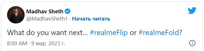 Jedná se o společnost realme. Naznačil to Madhav Sheth, viceprezident a prezident společnosti realme International, na Twitteru. Zeptal se fanoušků, který smartphone chce společnost oznámit jako první: realme Flip, nebo skládací smartphone ve tvaru knihy realme Fold.