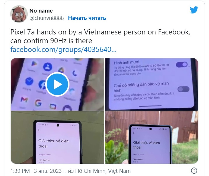 Video zveřejnil obyvatel Vietnamu, kterému se podařilo získat zařízení ještě před oznámením. Únik potvrzuje, že smartphone bude vypadat velmi podobně jako Pixel 7 a Pixel 7 Pro. Na rozdíl od současného modelu Pixel 6a bude navíc nové zařízení podporovat zvýšenou obnovovací frekvenci až 90 Hz.