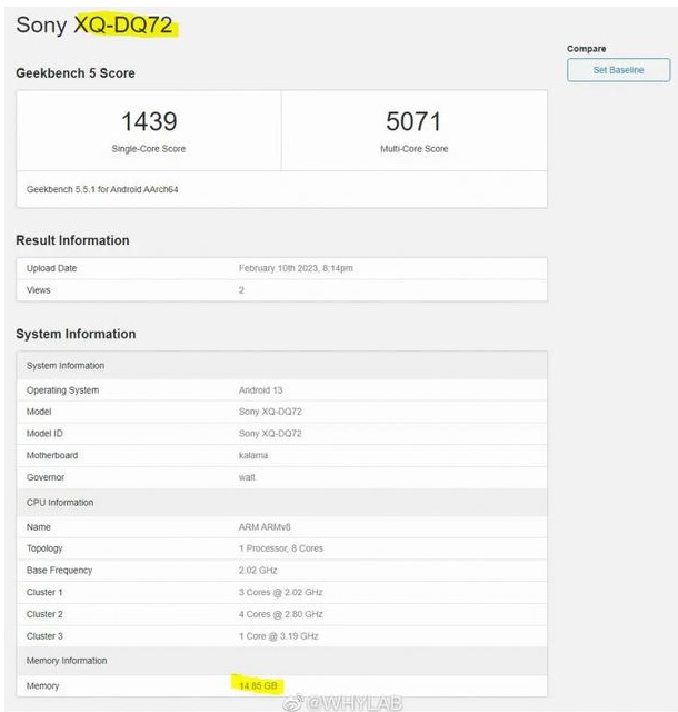 Podle databáze Geekbench poběží na Sony Xperia 5 V operační systém Android 13. Kapacita operační paměti bude 16 GB.