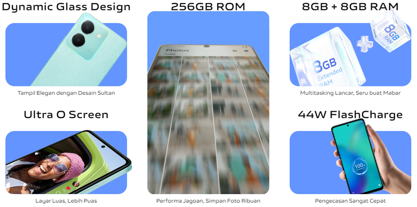 Bez ohledu na model čipu je smartphone vybaven 6,64" Full HD+ LCD displejem s obnovovací frekvencí 90 Hz. Rozlišení hlavního fotoaparátu je 50 MP + 2 MP, zatímco přední fotoaparát má 16 MP.